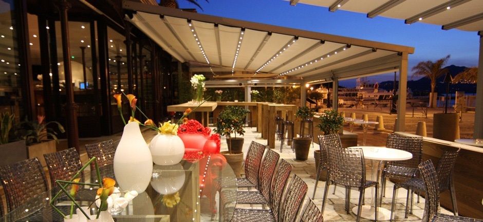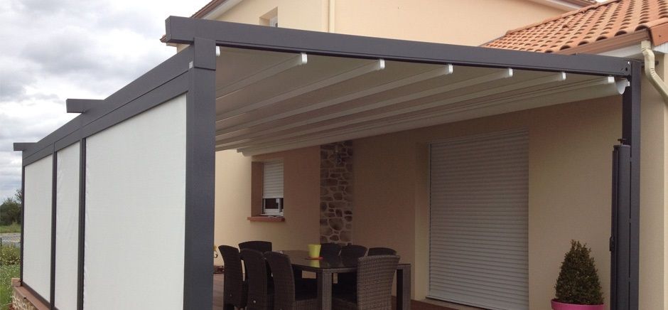 Estructura sombreante de aluminio con toldo que se puede empaquear, hecho por un tejido fijado a un sistema de perfiles transversales, carritos y guías que permiten el movimiento horizontal. A petición es posible colocar el sistema antigota para la protección de la lluvia. No se garantiza la resistencia bajo el peso de la nieve.