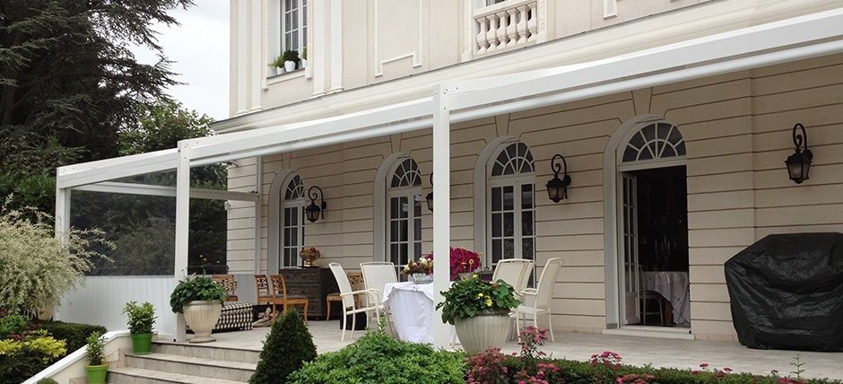 Estructura sombreante de aluminio con toldo que se puede empaquear, hecho por un tejido fijado a un sistema de perfiles transversales, carritos y guías que permiten el movimiento horizontal. A petición es posible colocar el sistema antigota para la protección de la lluvia. No se garantiza la resistencia bajo el peso de la nieve.