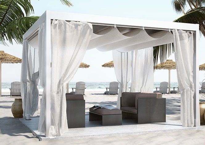 Estructura sombreante en aluminio con lona superior en tejido Soltis 86 y/o con toldo a escurrimiento manual caracterizada para su forma ondulada (S Light). A peticion se pueden instalar tambien toldas perimetricas. Estructura dedicada a la proteccion solar, no esta garantizada la resistencia a agua y nieve. Las dimensiones máximas recomendadas son: 700 cm de ancho, 350 cm de proyección.