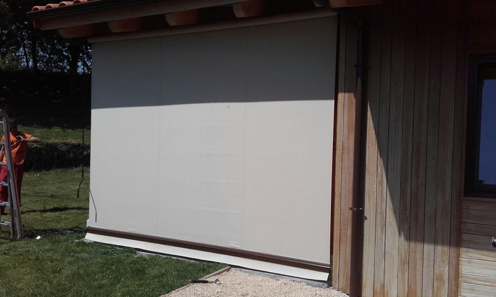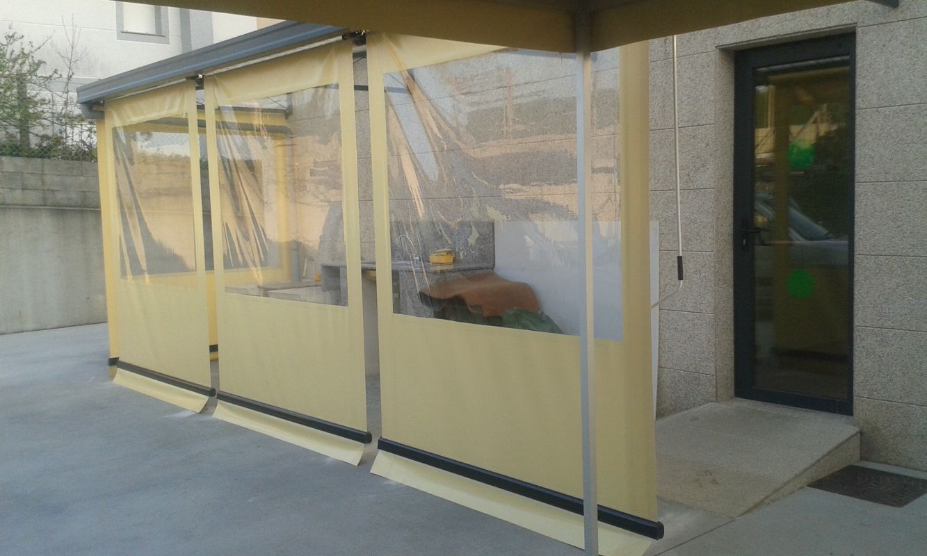 El Toldo Vertical es un toldo que desenrolla, cae tipo telón y se sujeta en el piso mediante pitón y mosquetones. Se puede realizar en lona o tela cristal transparente. Se puede accionar en forma manual o automática. Está indicado su uso en balcones, galerías, patios como cerramiento vertical. El sistema de recogida es muy básico, al igual que el resto de los toldos de telón, se basa en un eje enrollable donde la tela se va desenrollando según baja el toldo a su peso y de forma totalmente vertical hasta llegar al suelo. TOLDO VERTICAL SIN GUIA CORTAVIENTOS
